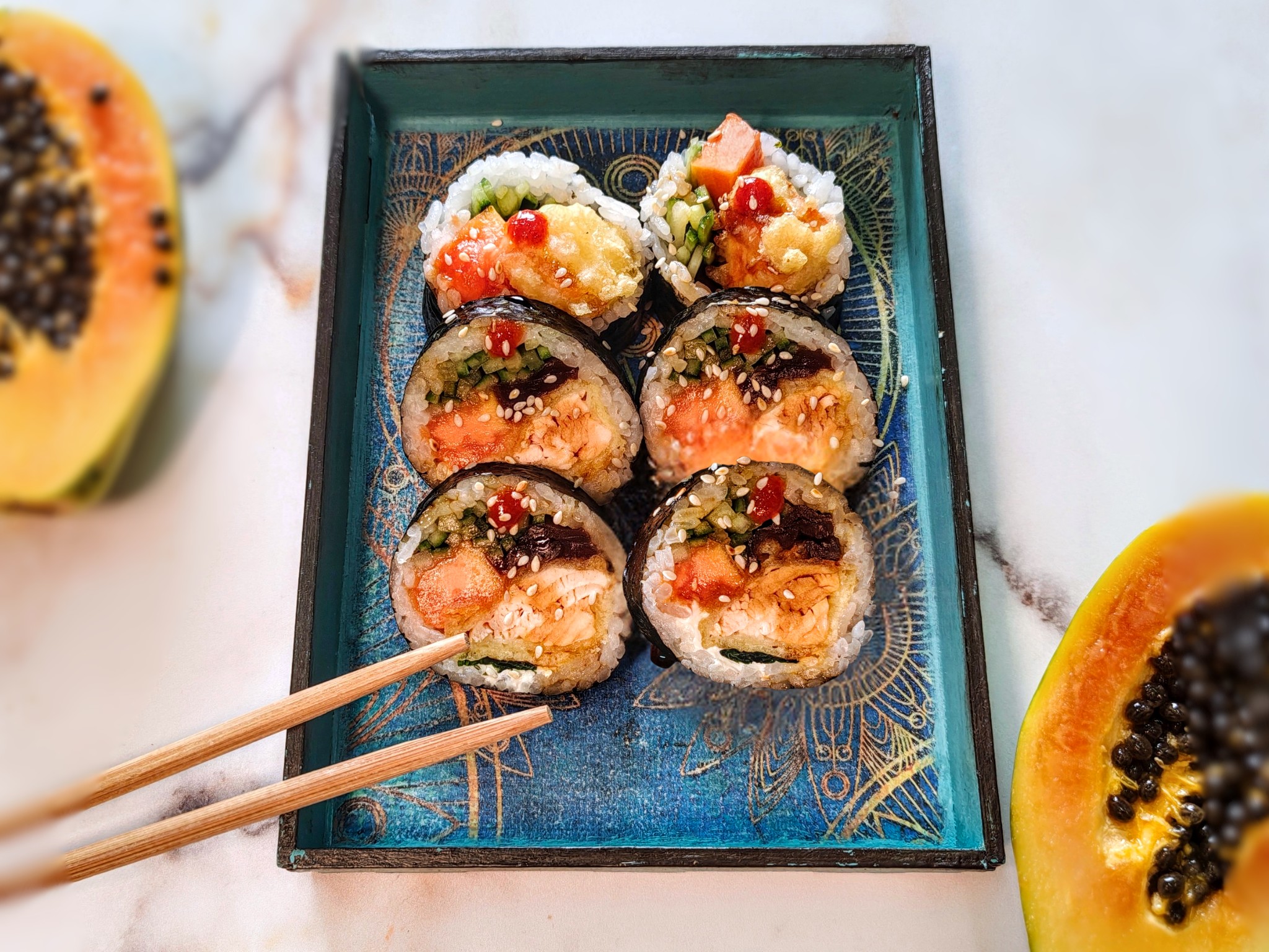 California - Tempura-Garnele und Lachs-Tatar auf einer Rolle